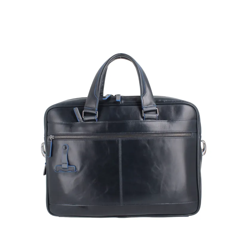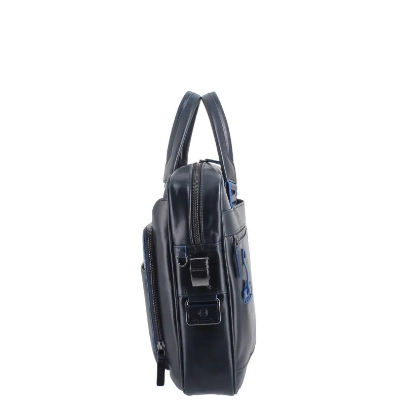 Aktentasche mit 2 Griffen und abnehmbarem, verstellbarem Schulterriemen aus der Blue Square Kollektion von Piquadro, mit internem 14"-Laptop-Fach, interner Organisation für Stifte und Dokumente. Vorderseite mit 2 großen Taschen für das Nötigste, Rückseite mit Schlaufe zur Befestigung am Trolley.