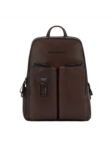Computerrucksack aus der Harper-Kollektion von Piquadro, aus weichem Naturleder, mit einem Doppelfach mit Reißverschluss, Tragegriff oben, zwei Vordertaschen mit Reißverschluss, gepolsterten und verstellbaren Schulterriemen, atmungsaktivem Rücken, Seitentaschen für Regenschirm und Wasserflasche.