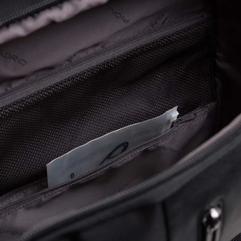 PC-Rucksack aus der Brief 2-Kollektion von Piquadro, aus regeneriertem Gewebe mit Wabenstruktur und natürlichem Rindsleder, Doppelfach, Seitentaschen für Flasche und Regenschirm, organisierte Vordertasche, gepolstertes Fach für 15,6"-PC und Tablet, Tragegriff oben, gepolsterte und verstellbare Schulterriemen, atmungsaktiver Rücken.