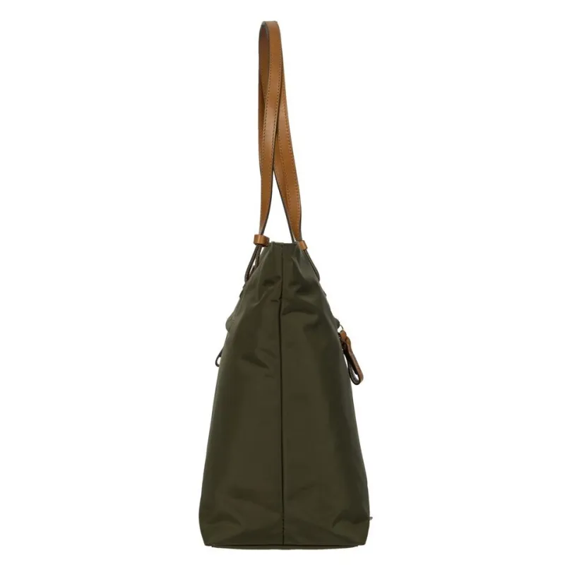 Mittelgroße Einkaufstasche aus der X-Travel-Kollektion von Bric's, mit doppeltem Unterarmgurt, Reißverschluss und vier Metallfüßen in Goldoptik zum Schutz vor Abnutzung. Zwei Reißverschlusstaschen auf der Rückseite, von denen eine auch als praktischer Gurt zur Befestigung am Trolleygriff dient, und eine doppelt gepolsterte Innentasche, die sich ideal für ein Tablet oder einen Laptop eignet.