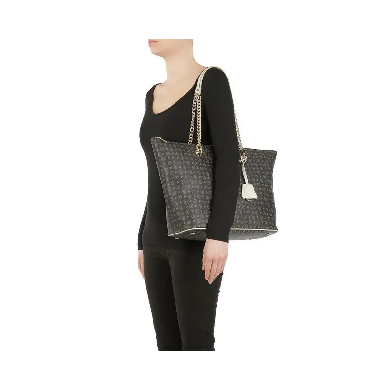Pollini Einkaufstasche in Stoff und Leder schwarz-elfenbein