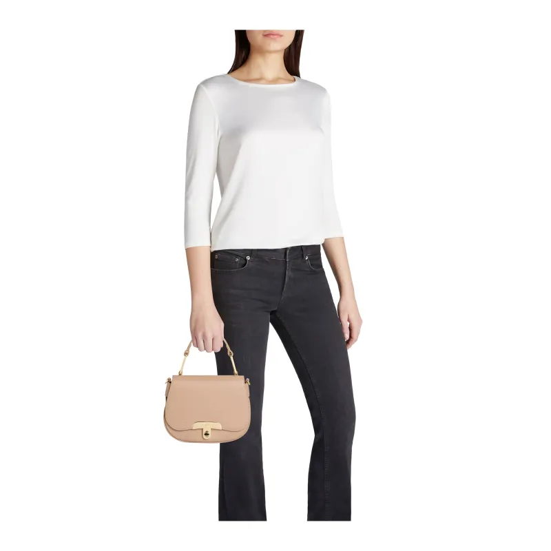 Die abgerundete Form mit Überschlagklappe wird durch einen goldenen Drehverschluss mit eingraviertem Braccialini-Logo veredelt – ein dezentes, luxuriöses Detail. Der obere Henkel mit Metallakzenten und der abnehmbare, verstellbare Schulterriemen bieten zwei Tragevarianten: in der Hand oder als Crossbody.