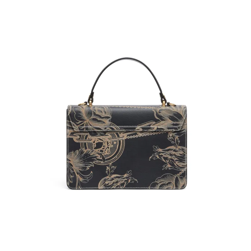 Gefertigt aus Naturleder, besticht sie durch eine strukturierte Form mit Blumen- und Kettenmotiv auf schwarzem Hintergrund, veredelt durch ein Schmetterlings-Juwelendetail auf der Klappe.