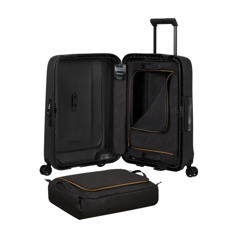 Die Essens-Kollektion von Samsonite ist vollständig umweltverträglich hergestellt. Die Schalen bestehen zu mindestens 70 % aus recyceltem post-consumer Polypropylen, Das Innenfutter und das innere Gurtband bestehen zu bzw. 97% & 100 % aus recyceltem PET.