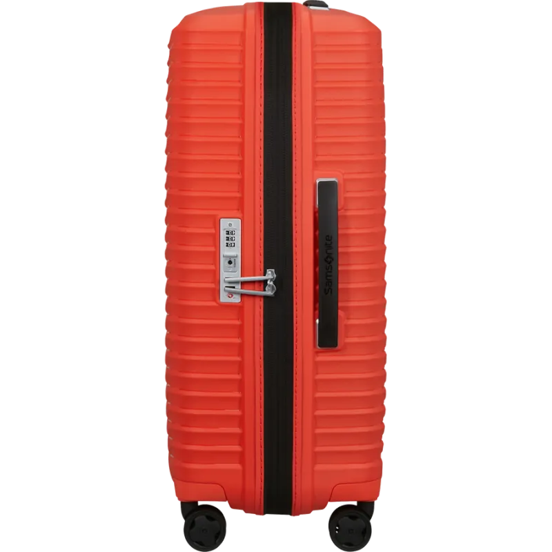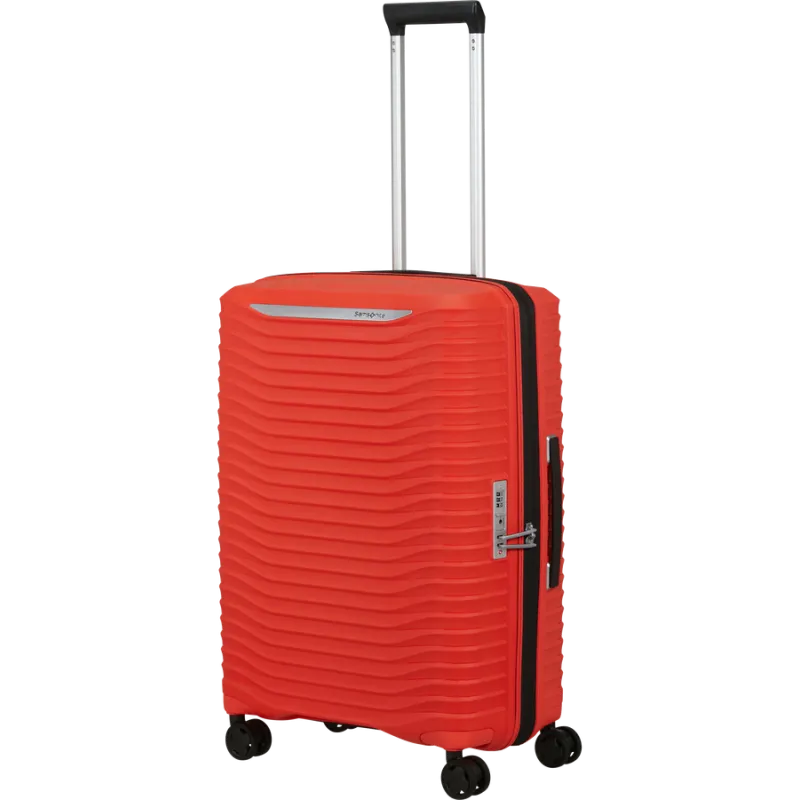 Leichter und strapazierfähiger mittelgroßer Trolley aus der Upscape-Kollektion von Samsonite, aus 100 % Polypropylen, ausgestattet mit Erweiterungsmöglichkeiten, Griffen an der Oberseite und an den Seiten, doppeltem Innenfach mit Trennwand und Befestigungsgurten, Reißverschluss, Kombinations- und TSA-Schloss für US-Reisen erforderlich, 4-Rad-Doppeltrolley-Zug.