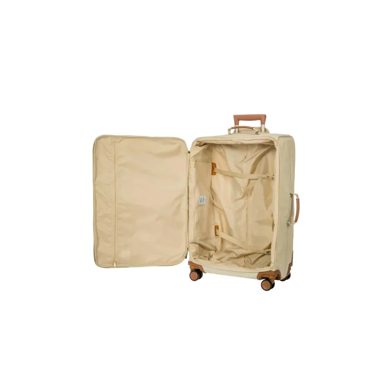 Der mittelgroße Trolley im Format 71 cm mit leichter, starrer Struktur ist aus Recycling-Stoff gearbeitet. Die Tasche wird mit einem Zweiwege-Reißverschluss geschlossen. Zwei Vordertaschen mit Reißverschluss, Innentaschen und Riemen ermöglichen eine optimale Organisation des Stauraums. Die leisen Rollen ermöglichen durch Pirouettieren eine mühelose 360°-Rotation des Trolleys und sind versenkt, um den Stauraum des Trolleys zu maximieren. Die gepolsterten Griffe sowie die stabilen Rohre aus Aluminium und der ergonomische Griff des Zugsystems gewährleisten Komfort. Mit integriertem Adressfach und kleinen Ringen ausgestattet, die für die Sicherung mit (separat erhältlichem) Vorhängeschloss angebracht sind. Ausgestattet mit Details aus echtem Leder, die für Brics charakteristisch sind, und mit Logo-Details.