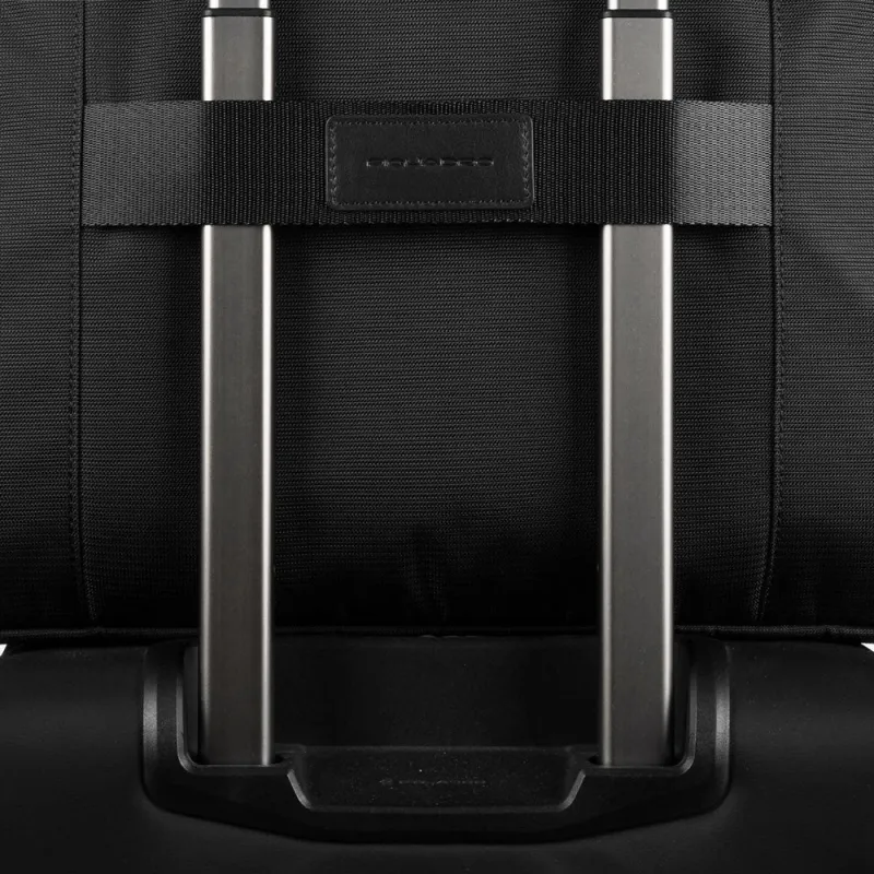 Aktentasche mit zwei Griffen aus der Mac-Beth-Kollektion von Piquadro, ausgestattet mit einem Doppelfach mit Reißverschlussöffnung, eines davon mit einem gepolsterten Fach für Computer und Tablet, verstellbarer und abnehmbarer Schultergurt, doppelte Fronttasche mit Reißverschluss, Rückenschlaufe zur Befestigung am Trolley.