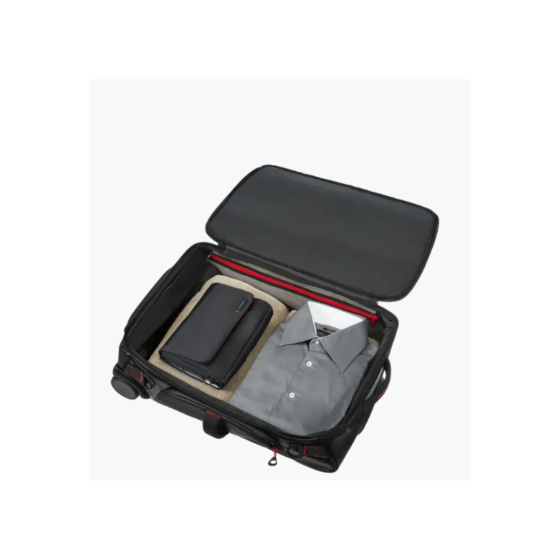 Rucksack-Trolley aus der Paradiver light Kollektion von Samsonite, aus widerstandsfähigem und wasserdichtem Gewebe, ausgestattet mit seitlichen Griffen, oberem und vorderem Griff, Trolley-Zugvorrichtung mit zwei Rädern, abnehmbaren Schultergurten, Reißverschlussöffnung, Außentaschen für wichtige Gegenstände.