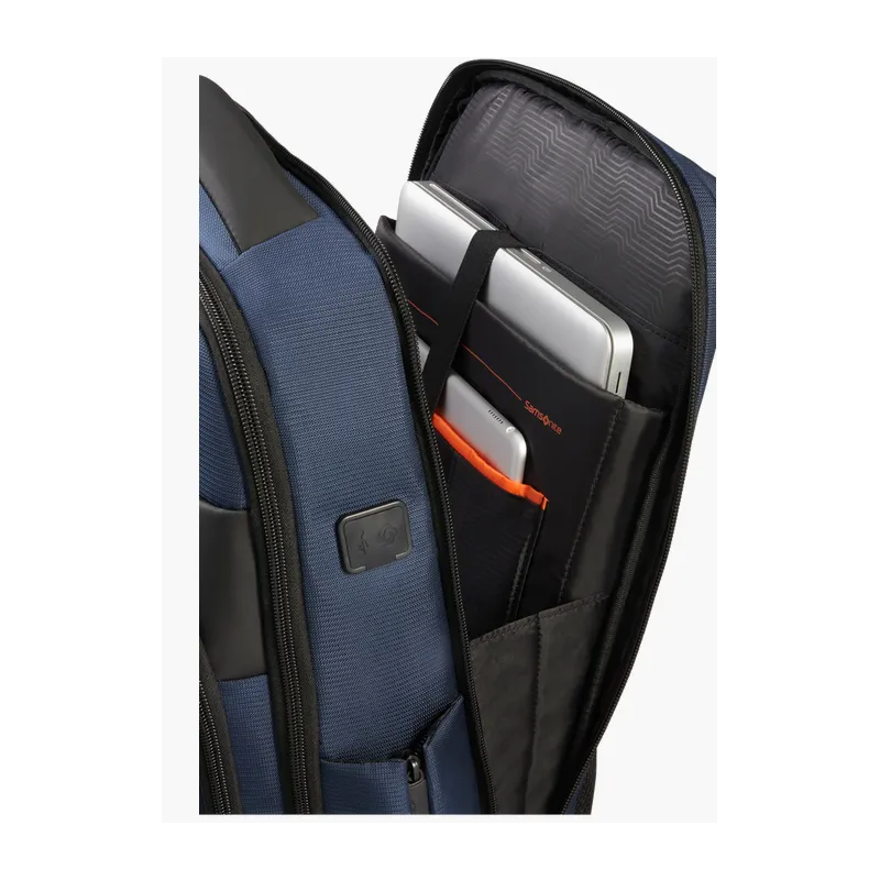 Rucksack aus der Mysght-Kollektion von Samsonite, aus strapazierfähigem Material, mit doppeltem Reißverschlussfach, davon ein gepolstertes Fach für Computer und Tablet, Tragegriff oben, Reißverschlusstasche vorne, Seitentaschen für Regenschirm oder Wasserflasche, integrierte USB-Platte zum Laden elektronischer Geräte, atmungsaktiver Rücken mit Trolley-Befestigungsschlaufe, gepolsterte und verstellbare Schultergurte.