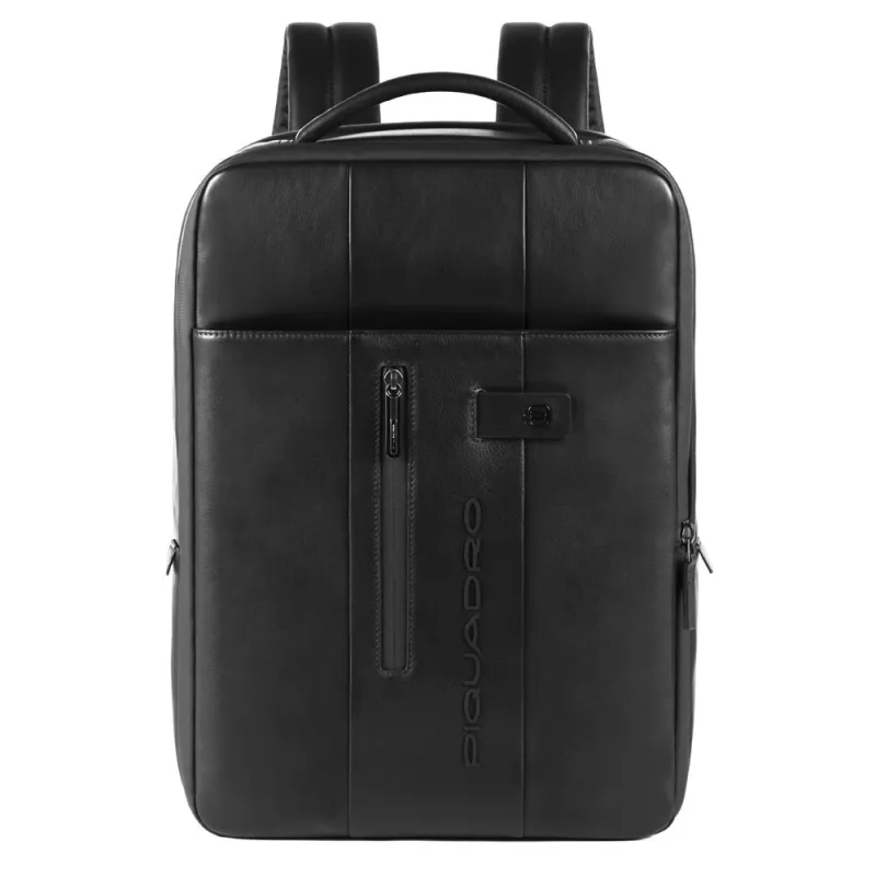 Schlanker Rucksack aus der großartigen Urban-Kollektion von Piquadro, mit Tragegriff, Erweiterungsmöglichkeit, doppeltem Reißverschlussfach, davon ein gepolstertes Fach für Computer und iPad, hintere Schlaufe für Trolley-Befestigung, Fronttasche für das Nötigste.