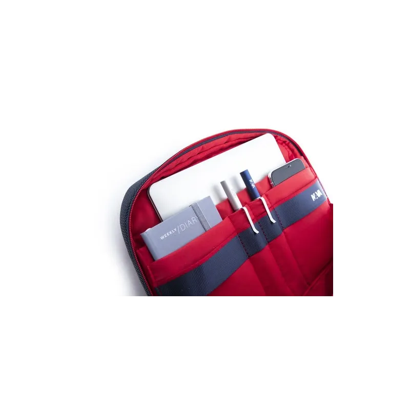 Kompakter Rucksack aus der Cross-Kollektion von Nava Design, aus Stoff und PU mit glänzendem/mattem Effekt, mit einem einzigen Fach mit Reißverschluss, Vordertasche mit kontrastfarbigem Reißverschluss.  Das große Innenfach ist mit Stifthalter, Fächern für Geräte, Dokumente und persönliche Gegenstände sowie einem speziellen Fach für Notebooks und Tablets ausgestattet. Der Rücken ist mit einer Trolley-Befestigungstasche ausgestattet und die Rücken- und Schultergurte sind gepolstert und atmungsaktiv. Ein informeller, voll ausgestatteter Rucksack in modernem Stil, der sowohl für die Arbeit als auch für die Freizeit geeignet ist.