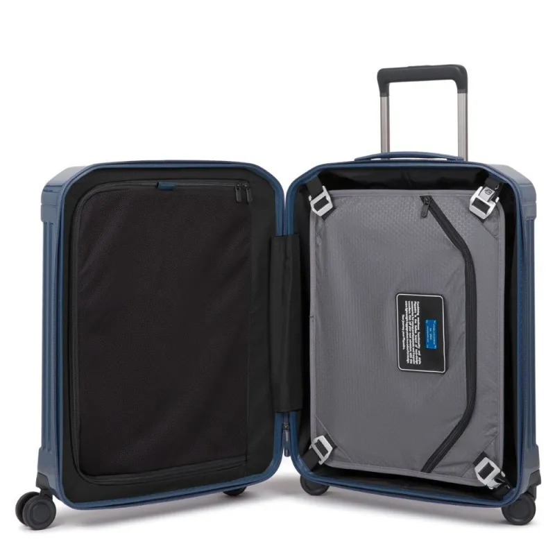 Piquadro-Trolley aus der PQ-Light-Kollektion, aus strapazierfähigem Polycarbonat, mit Reißverschluss und dreistelliger Zahlenkombination und TSA-pflichtig für Reisen in die USA, doppeltes Innenfach, 4-Rad-Zugvorrichtung.