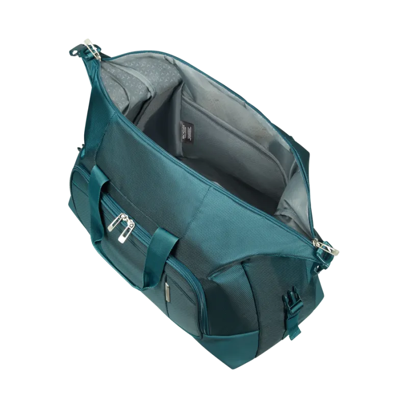 Reisetasche aus der Respark-Kollektion von Samsonite, vollständig aus recycelten Stoffen hergestellt, mit zwei Griffen, Reißverschluss, verstellbarem und abnehmbarem Schultergurt, Trolley-Befestigungsschlaufe auf der Rückseite.