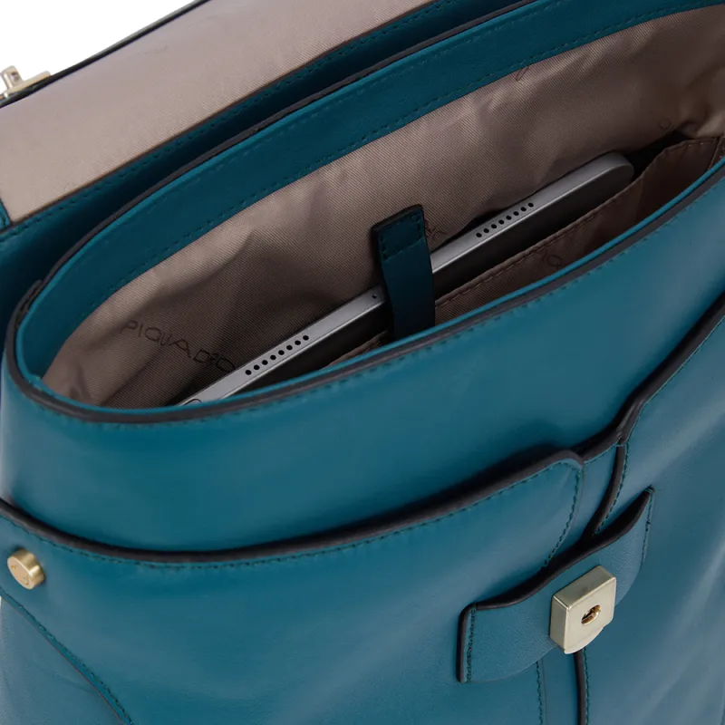 Damen-Rucksack aus der Ray-Kollektion von Piquadro aus feinem Naturleder, mit Klappverschluss, iPad®-fach, verstellbaren Schulterriemen aus Stoff und Trolley-Befestigungssystem mit Schlaufe.