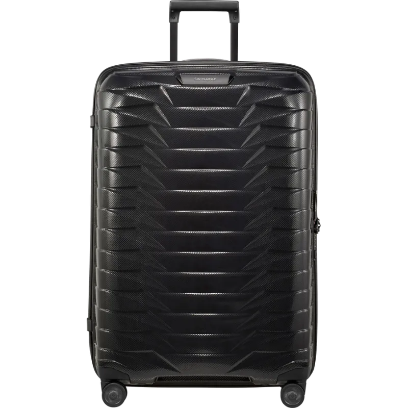 Großer Trolley aus der Proxis-Linie von Samsonite, aus sehr starkem Polypropylen mit Roxkin-Verarbeitung, ausgestattet mit Tragegriff oben und an der Seite, Zahlenschloss und TSA-pflichtig für Reisen in die USA, Zugvorrichtung mit Doppeltrolley und 4 Rollen, doppeltes Innenfach mit doppelter Trennwand, integrierter und versenkbarer Adresshalter.