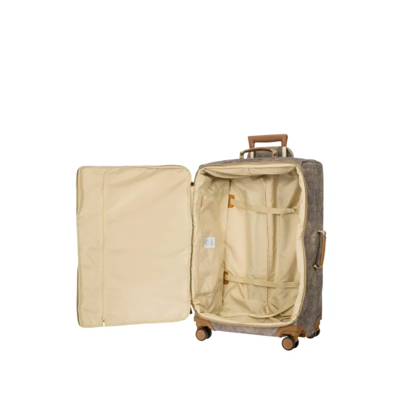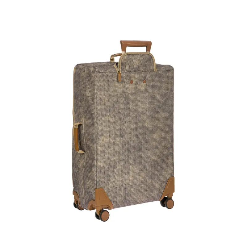 Der mittelgroße Trolley im Format 71 cm mit leichter, starrer Struktur ist aus Recycling-Stoff gearbeitet. Die Tasche wird mit einem Zweiwege-Reißverschluss geschlossen. Zwei Vordertaschen mit Reißverschluss, Innentaschen und Riemen ermöglichen eine optimale Organisation des Stauraums. Die leisen Rollen ermöglichen durch Pirouettieren eine mühelose 360°-Rotation des Trolleys und sind versenkt, um den Stauraum des Trolleys zu maximieren. Die gepolsterten Griffe sowie die stabilen Rohre aus Aluminium und der ergonomische Griff des Zugsystems gewährleisten Komfort. Mit integriertem Adressfach und kleinen Ringen ausgestattet, die für die Sicherung mit (separat erhältlichem) Vorhängeschloss angebracht sind. Ausgestattet mit Details aus echtem Leder, die für Brics charakteristisch sind, und mit Logo-Details.