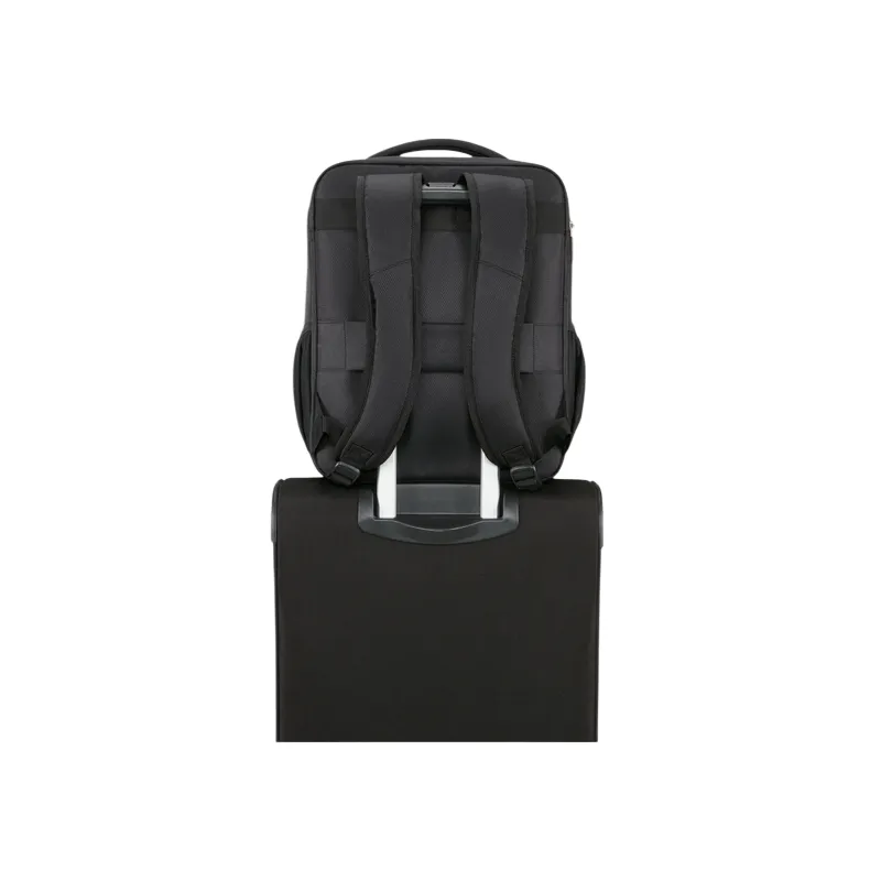 Ausgestattet mit oberem Tragegriff und verstellbaren Schultergurten sorgt er fuer angenehmen Tragekomfort. Die rueckseitige Trolley Befestigung ermoeglicht einfaches Aufsetzen auf einen Koffer.