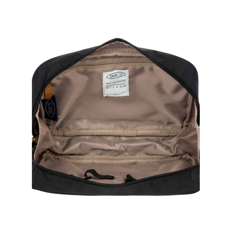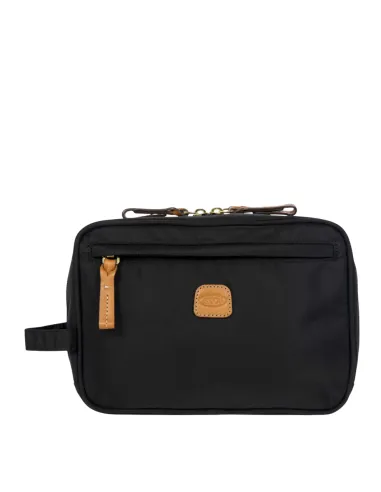 The Necessaire from the X-Collection is made of soft, lightweight and durable recycled nylon, water-proof. It makes a great sponge bag to hold all your personal care items. There is a convenient handle on the side. Its spacious design makes it particularly practical. This bag includes an external zipped pocket, an internal zipped pocket, side compartments and practical elastics to organise your accessories. The main compartment is equipped with a zip with two sliders. Embellished with genuine leather details, one of Bric's signature design elements.