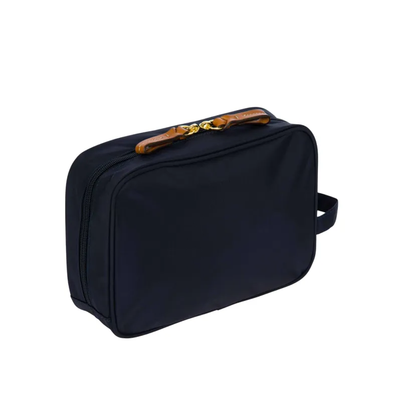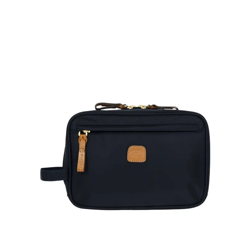 The Necessaire from the X-Collection is made of soft, lightweight and durable recycled nylon, water-proof. It makes a great sponge bag to hold all your personal care items. There is a convenient handle on the side. Its spacious design makes it particularly practical. This bag includes an external zipped pocket, an internal zipped pocket, side compartments and practical elastics to organise your accessories. The main compartment is equipped with a zip with two sliders. Embellished with genuine leather details, one of Bric's signature design elements.