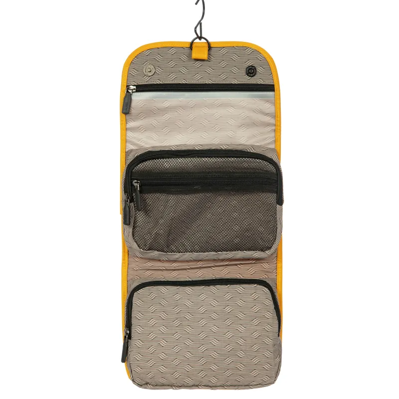 The folding necessaire from the Ulisse collection holds all your personal care items, combining style and practicality. The shape is compact and the inner pockets are roomy. It is characterised externally by a graphic design reminiscent of a subway map. The wallet opening allows it to be opened fully, and the built-in hook allows it to be hung. Three zippers divide the beauty case into compartments, one of which has a transparent mesh, so you can keep your care and beauty products handy and safe from moisture. Made of water-repellent material with a fabric lining, it features a two-button clip closure and is embellished with the B|Y Bric's logo.