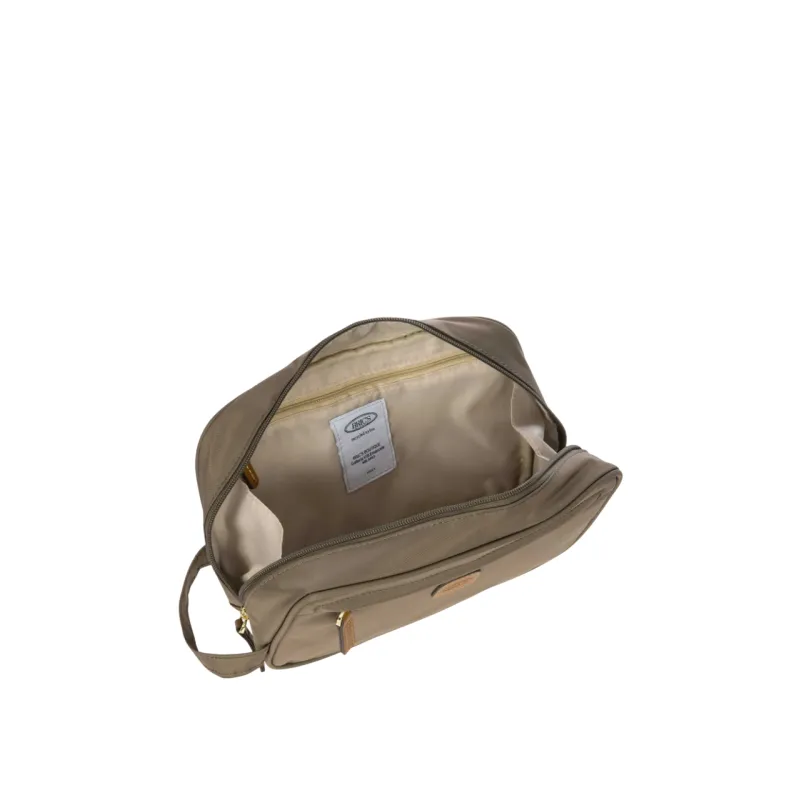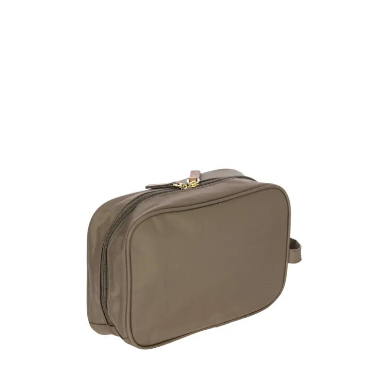 The Necessaire from the X-Collection is made of soft, lightweight and durable recycled nylon, water-proof. It makes a great sponge bag to hold all your personal care items. There is a convenient handle on the side. Its spacious design makes it particularly practical. This bag includes an external zipped pocket, an internal zipped pocket, side compartments and practical elastics to organise your accessories. The main compartment is equipped with a zip with two sliders. Embellished with genuine leather details, one of Bric's signature design elements.