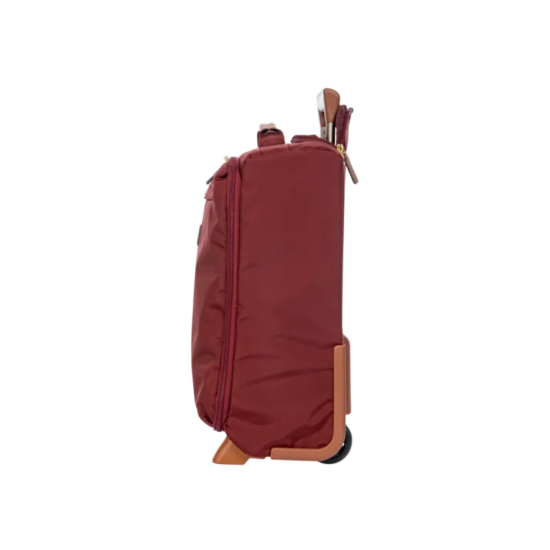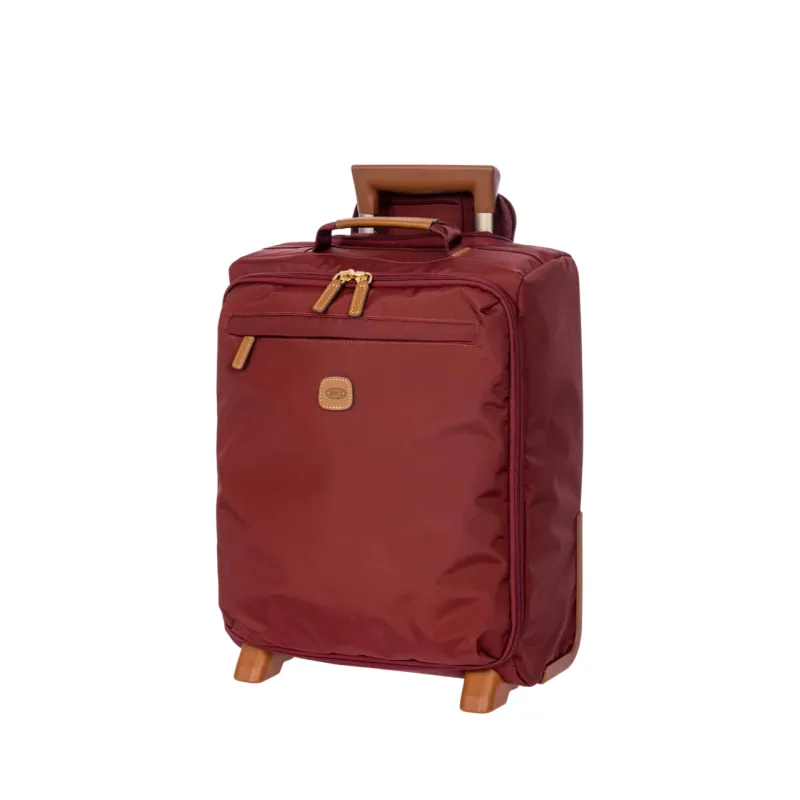The X-Collection underseat cabin trolley features the right dimensions to fit in the underseat compartment on an airplane. It allows you to maximise the capacity of your carry-on luggage, in a more compact form. Made from durable recycled nylon, strong and waterproof, with a rigid yet light structure. The main compartment is equipped with a zip featuring two sliders. External front pocket and internal zipped pocket for optimal space organisation. Complete with an address tag and rings for a padlock (sold separately). The two silent castors, the sturdy and stable aluminium tubes and the ergonomic handle ensure comfortable use. Finished with genuine leather parts, one of Bric's signature design elements, and the brand's logo.