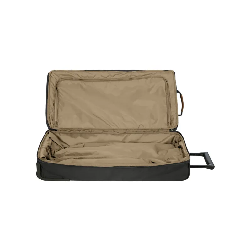 High quality wheels ensure smooth movement, supported by stabilizing feet that keep the duffel upright when stationary. Genuine leather trims and the soft fabric lining enrich the design, adding a refined touch that makes this X Collection duffel an essential travel companion.