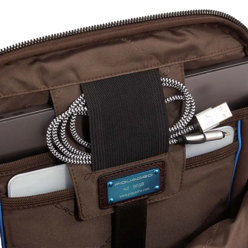 Piquadro collections include laptop backpacks in various sizes – from compact tablet models to larger ones for 17” devices, some with compartments for clothing – as well as briefcases, business bags, travel backpacks, and trolleys in polycarbonate or technical fabric with TSA locks and USB ports.