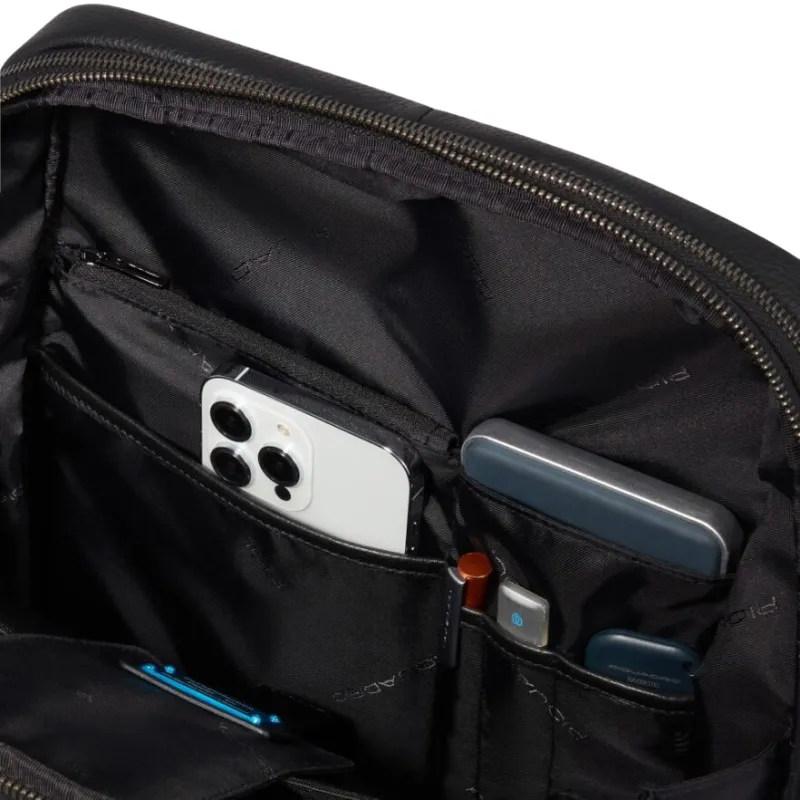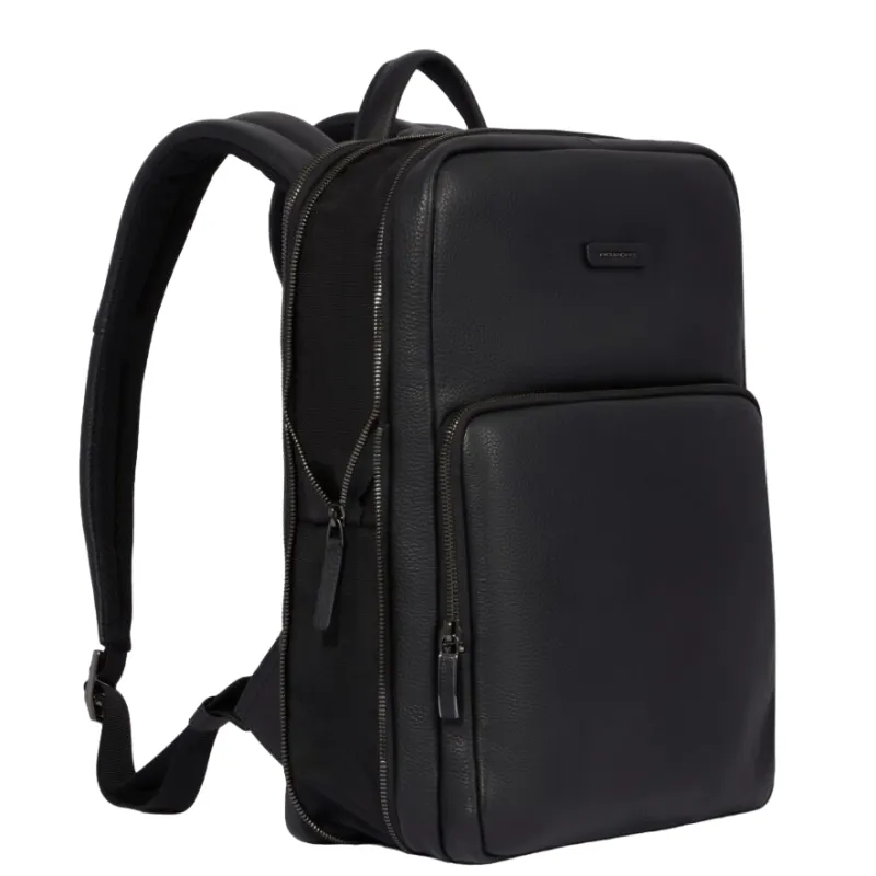 Piquadro collections include laptop backpacks in various sizes – from compact tablet models to larger ones for 17” devices, some with compartments for clothing – as well as briefcases, business bags, travel backpacks, and trolleys in polycarbonate or technical fabric with TSA locks and USB ports.