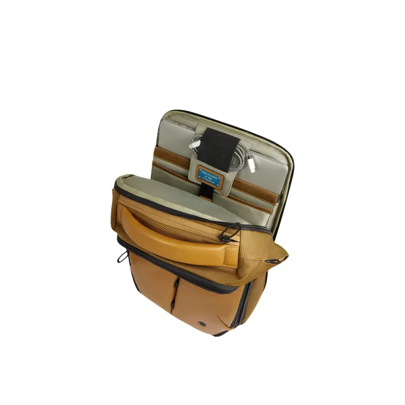 Piquadro collections include laptop backpacks in various sizes – from compact tablet models to larger ones for 17” devices, some with compartments for clothing – as well as briefcases, business bags, travel backpacks, and trolleys in polycarbonate or technical fabric with TSA locks and USB ports.