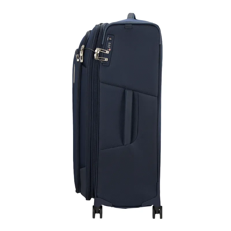 Large expandable trolley from Samsonite's Respark collection, made of strong recycled fabric, with large compartment with zip, combination and tsa lock necessary for travelling to the USA, front pocket with zip, 4-wheel towing .