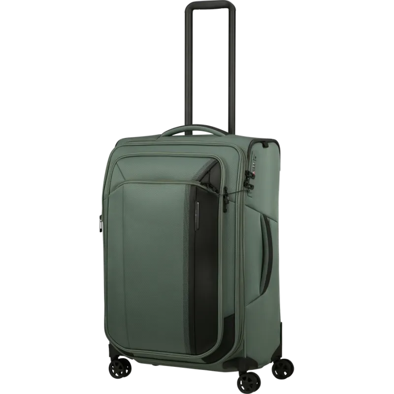 Medium expandable trolley from Samsonite's Respark collection, made of strong recycled fabric, with large compartment with zip, combination and tsa lock necessary for travelling to the USA, front pocket with zip, 4-wheel towing .