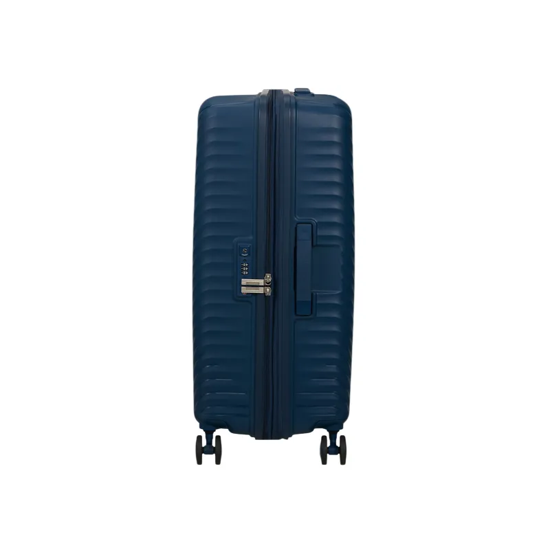 American Tourister Diablast medium expandable trolley made of polypropylene designed for medium length travel combining lightweight construction with high durability. The rigid polypropylene shell provides strong impact resistance while maintaining reduced weight.