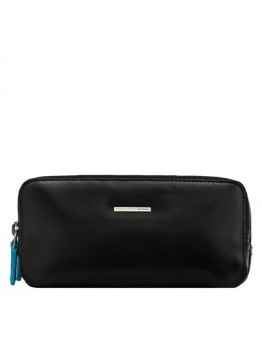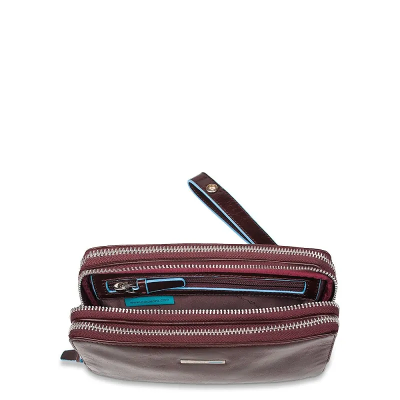 Three-compartment pouch from Piquadro's Blue Square collection, featuring a removable ribbon shoulder strap, a removable leather handle, 12 interior credit card slots with anti-fraud protection.