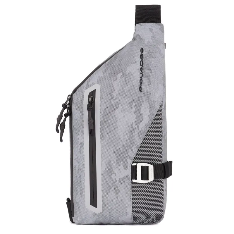 One shoulder bag from the PQM collection by Piquadro, made of strong regenerated fabric, with zip opening, inside compartment for tablet, outside pockets with zip.