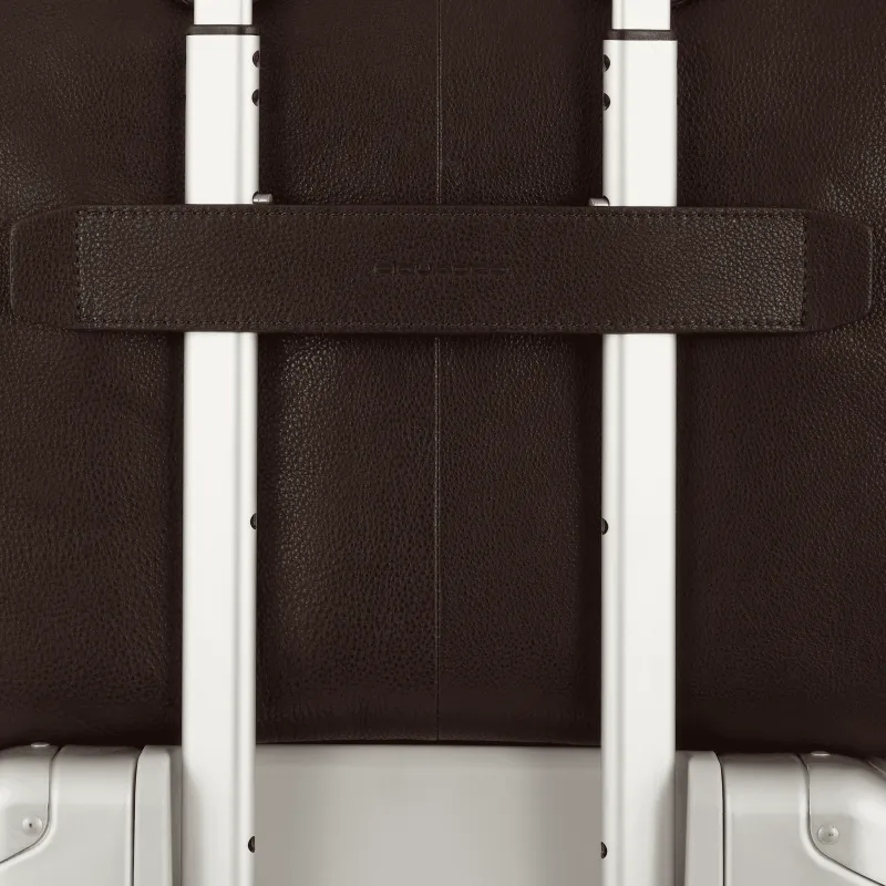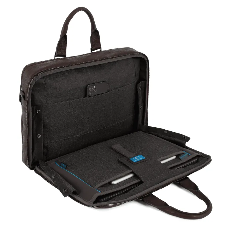 Computer and iPad®Pro 12,9, fast-check portfolio briefcase from the Piquadro's Martin collection, made of genuine leather, with two zipped compartments, two handy front pockets, one with a zip and one with a flap, adjustable and removable shoulder strap and trolley strap