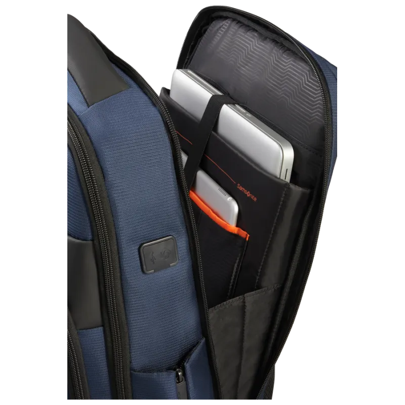 Backpack from the Samsonite Mysght collection, made of strong fabric, featuring a double zipped compartment, one of which is organised with a padded compartment for computer and tablet, top handle, front zipped pocket, side pockets for umbrella or water bottle, integrated USB plate for charging electronic devices, breathable back with trolley attachment loop, padded and adjustable shoulder straps.