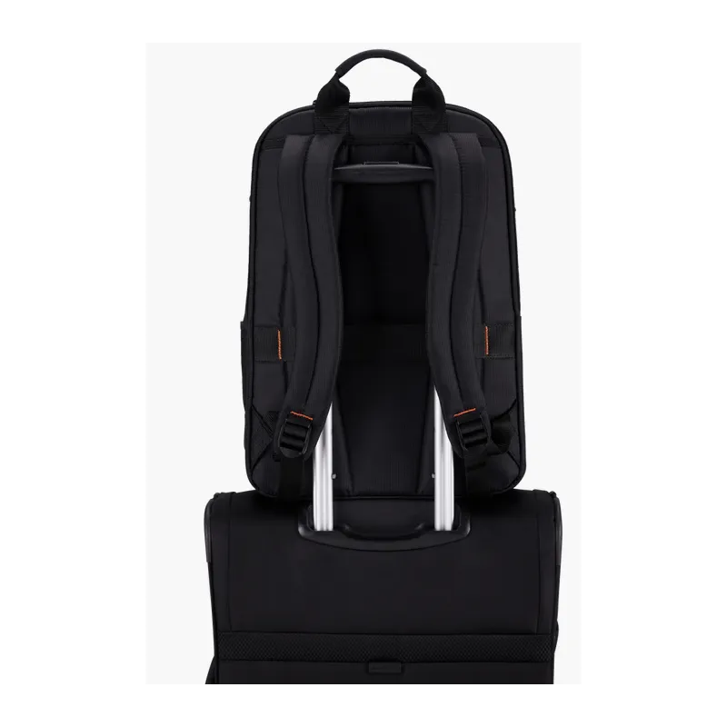 Backpack from Samsonite's Network collection, made from durable waterproof fabric, featuring a double zipped compartment, one of which is organised with a computer and tablet pocket, two front zipped pockets, and a pocket on the back for attaching to a trolley, padded and adjustable shoulder straps.
