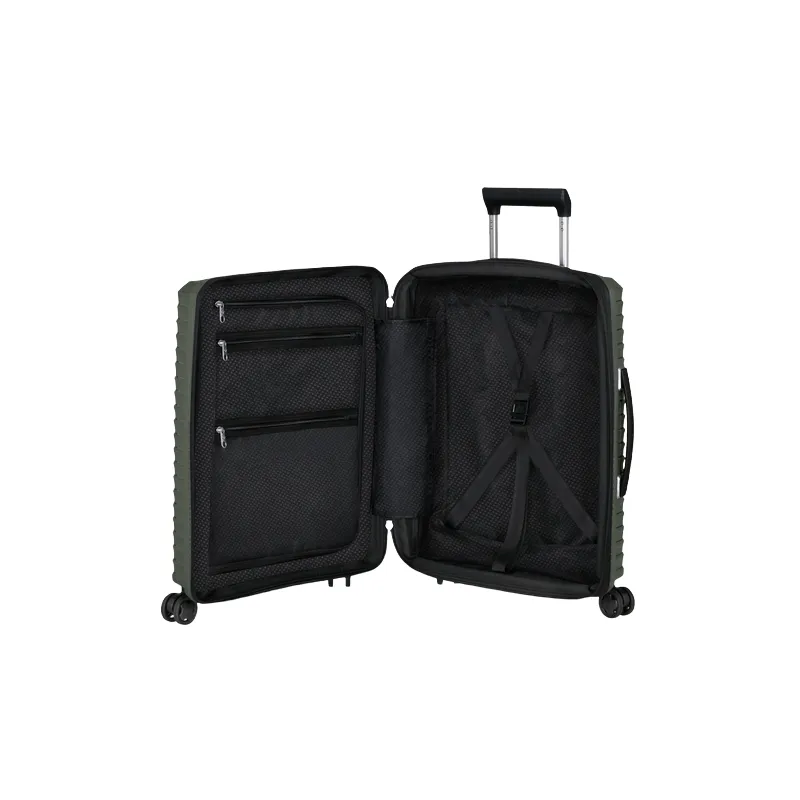 Expandable cabin trolley from the Samsonite Upscape collection, made of strong polypropylene, equipped with a combination lock and TSA required for US travel, USB port to charge electronic devices, 4-wheel towing.