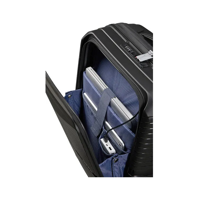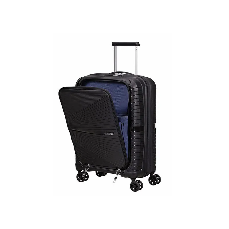 Cabin size trolley from American Tourister's Airconic collection, made of Polypropylene, featuring main compartment with zip, combination and TSA lock required for travel to the USA, front organised pocket for 15.6" laptop, tablet and accessories, 4 wheel towing system.