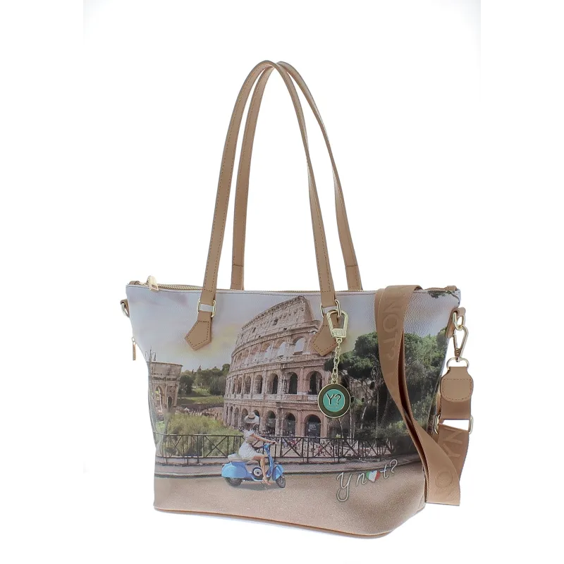 Large shopping bag from the Yes line by Ynot, made from durable fabric with natural leather trim, featuring a zipped opening, external side pocket with zip, adjustable and removable fabric shoulder strap.