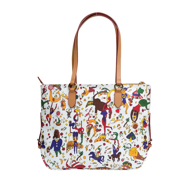 Medium shopping bag from the Magic Circus collection by Piero Guidi, made of strong embossed fabric with leather details, equipped with a large compartment with zip closing.