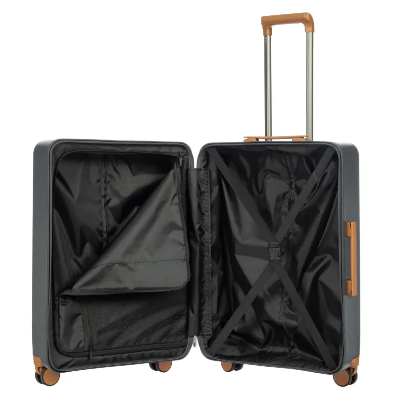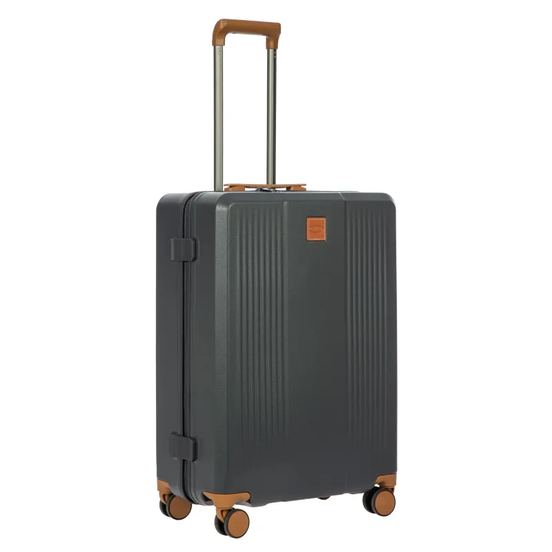 The Ravenna Collection Medium trolley features a bright colour and is made of polypropylene, a lightweight and durable material. The opening has a double-slider zipper, embellished with a tone-on-tone finish. The TSA padlock is integrated. The four wheels are silent and swivel to ensure smooth 360° movement. They are also recessed to maximise trolley capacity. Internally, the trolley has a zippered pocket and is divided into two separate compartments to help organise your belongings. Finished with a fabric lining. For ease of use, the towing system consists of strong and stable, multi-stop aluminium tubes with ergonomic grip. The trolley is embellished with Bric's refined logo.