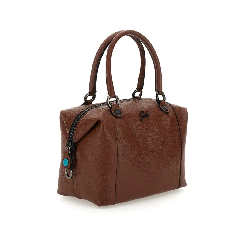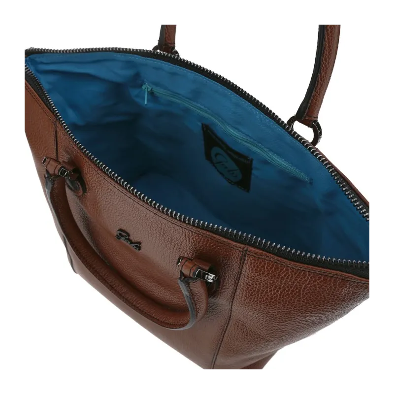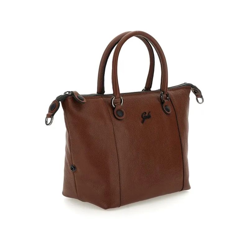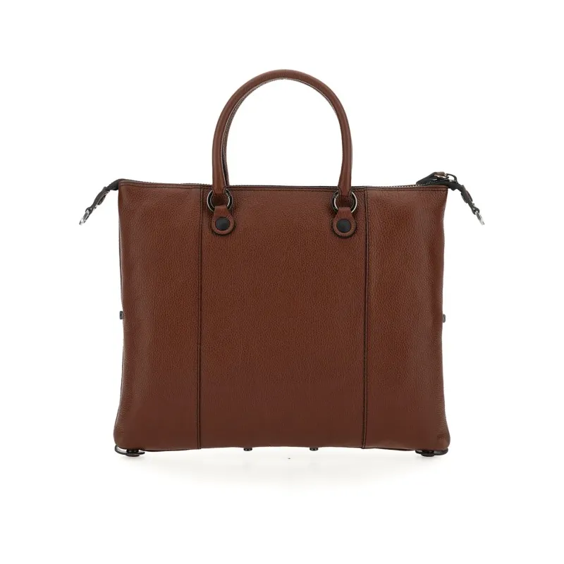 Made of natural, grained leather. Zipper opening, double handles, removable ribbon shoulder strap, internal base that helps to maintain the shape of the bag, internal folding bag.