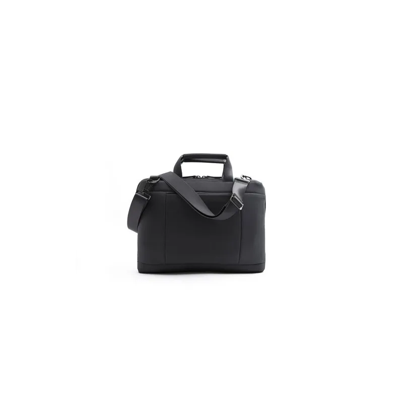 2-handles computer briefcase from the Cross collection by Nava Design, made of polyester fabric, with a single compartment with zip fastening, front pocket with zip closure, internally organised with a padded computer pocket and other pockets for pens, smartphones, adjustable and removable shoulder strap and trolley attachment pocket.