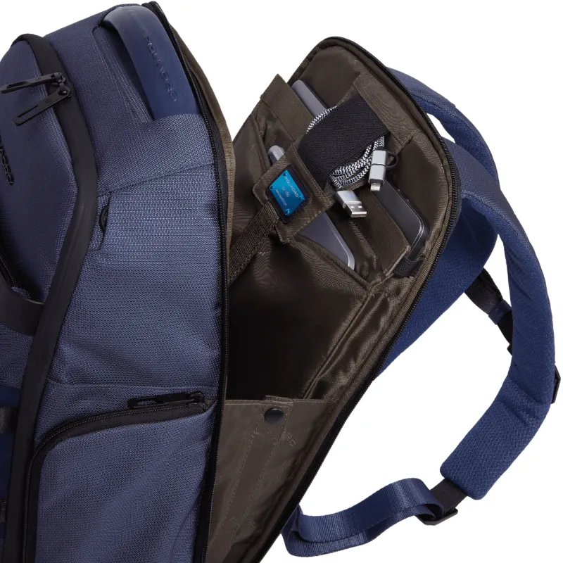 Piquadro collections include laptop backpacks in various sizes – from compact tablet models to larger ones for 17” devices, some with compartments for clothing – as well as briefcases, business bags, travel backpacks, and trolleys in polycarbonate or technical fabric with TSA locks and USB ports.
