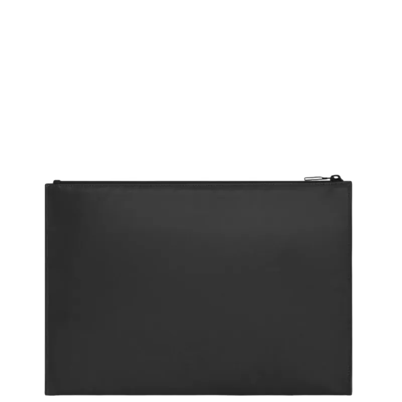 Most leather goods are crafted from Italian full-grain leather or technical and mixed materials. The brand also offers wallets for men and women, key holders, leather belts, and tech accessories such as wireless chargers and leather AirPods cases. Many items come with RFID protection.