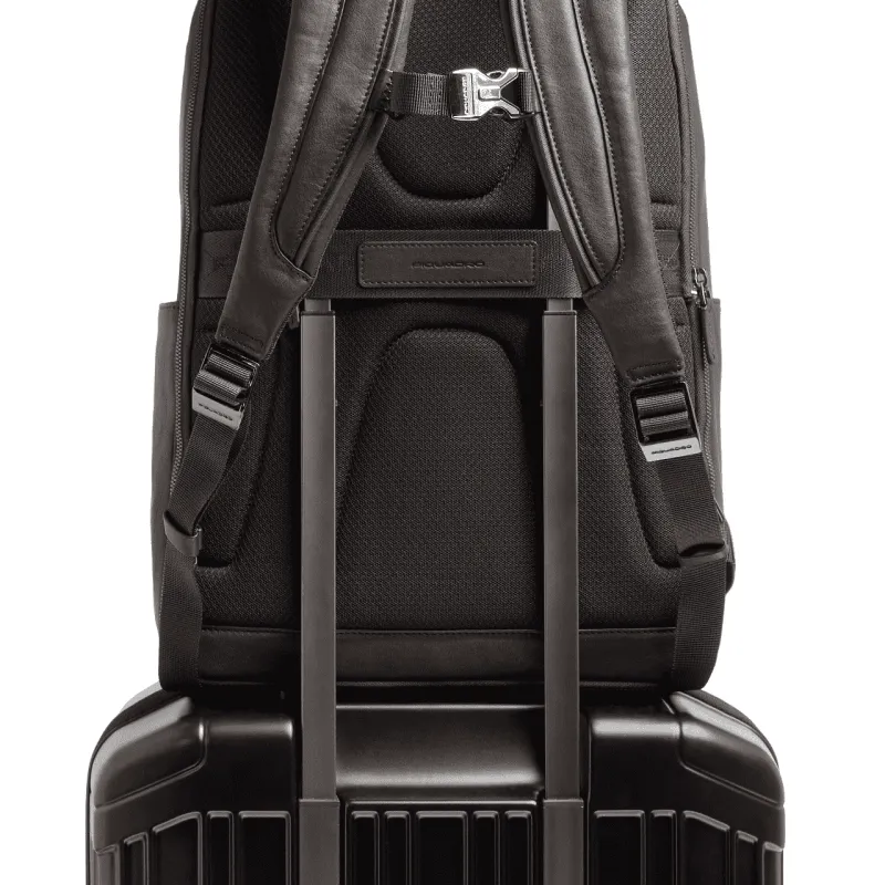 Piquadro collections include laptop backpacks in various sizes – from compact tablet models to larger ones for 17” devices, some with compartments for clothing – as well as briefcases, business bags, travel backpacks, and trolleys in polycarbonate or technical fabric with TSA locks and USB ports.