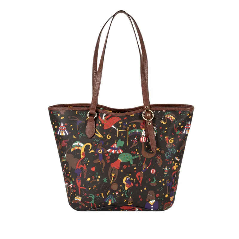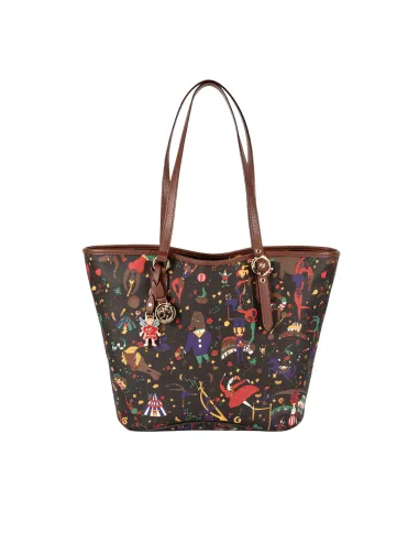 The Piero Guidi Matilda Magic Circus shopping bag combines refined Italian craftsmanship with artistic flair. Made from embossed fabric featuring the signature Magic Circus print, and enriched with leather trim details, it offers durability and unmistakable character.
