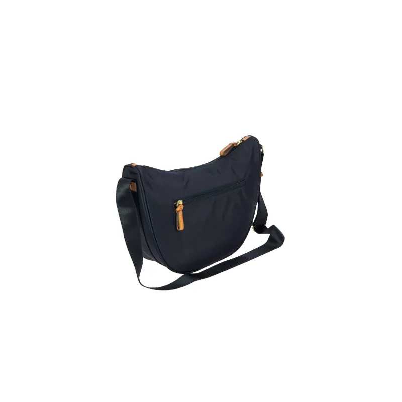 The small Halfmoon bag from the X-Collection is made of soft, lightweight and durable recycled nylon, water-proof. Thanks to the adjustable shoulder strap, it can be comfortably carried either on the shoulder or across the body. The crescent shape is very spacious, making it ideal for everyday use. Featuring an exterior zipped pocket on the back and an internal zipped pocket, it is ideal for organising your belongings. The bag is finished with genuine leather details and fabric lining. Embellished with the iconic Bric's logo in leather on the outside.